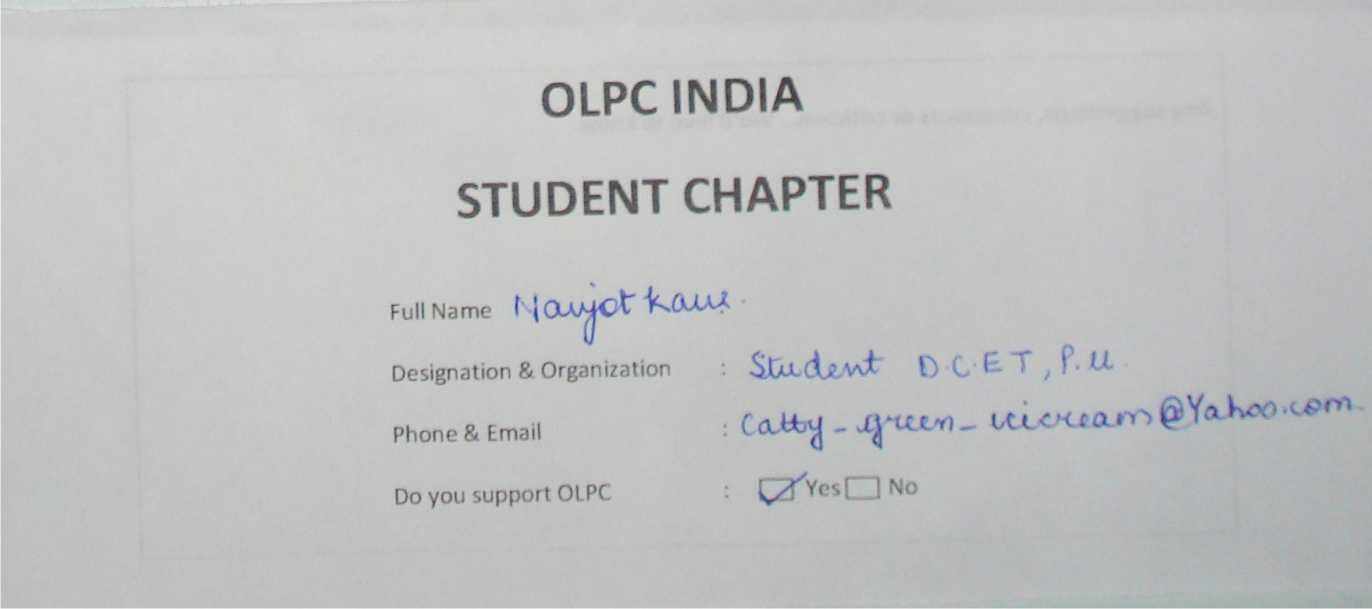 Membership form of OLPC India Student Chapter