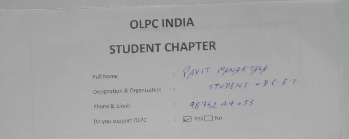Membership form of OLPC India Student Chapter