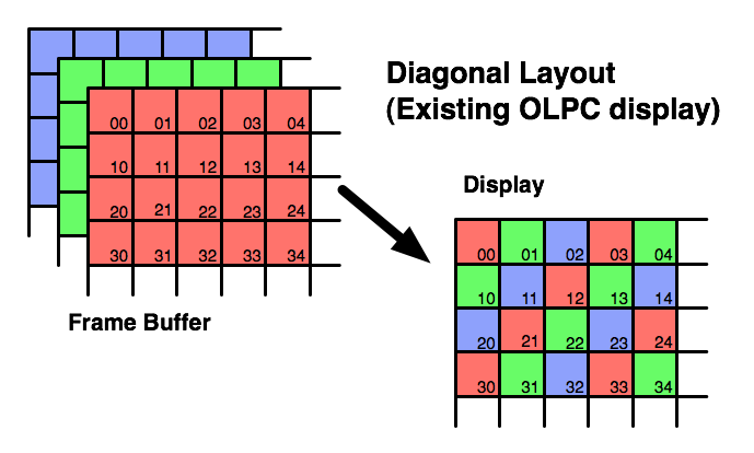 This shows the pixel layout in the OLPC XO display, and how pixels in the frame buffer are mapped to it.