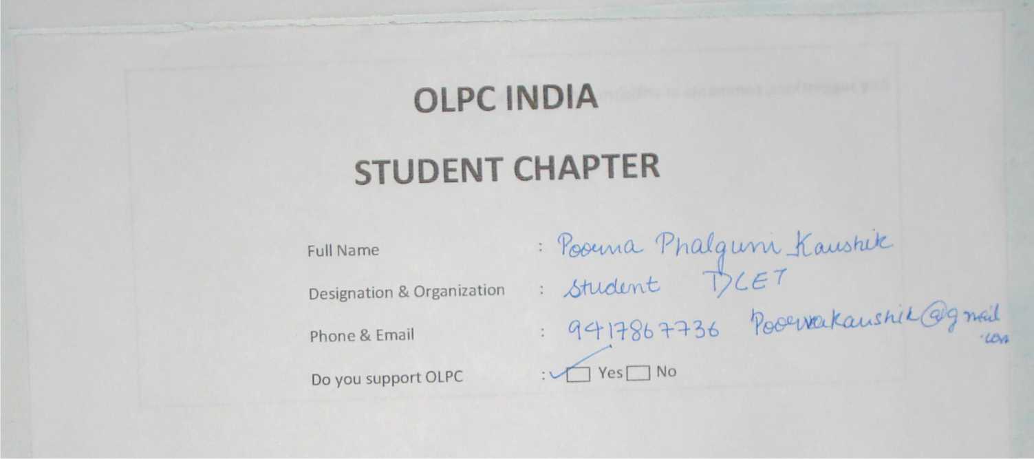 Membership form of OLPC India Student Chapter