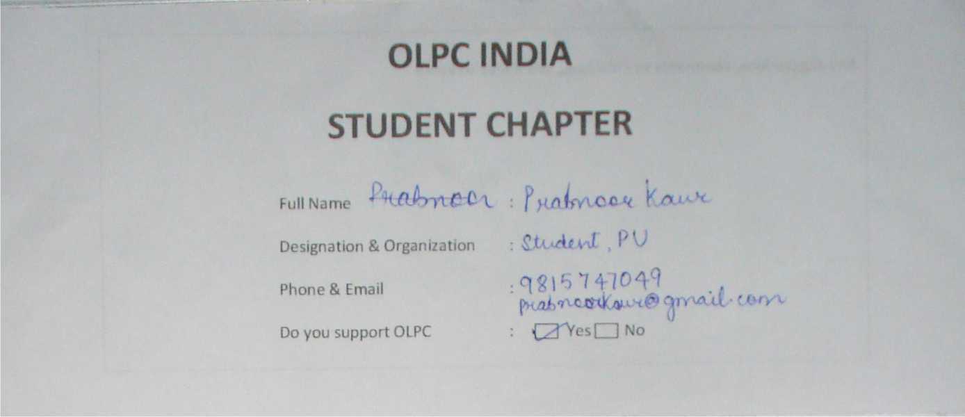 Membership form of OLPC India Student Chapter