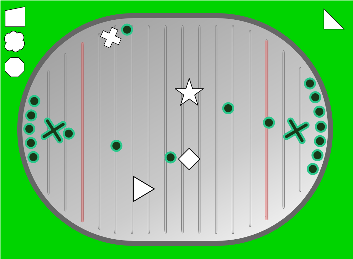 Spray Play concept design. Upper areas with shapes are the score board (shapes shot into opponent's goal area are collected in your side's area). The red-tinted line defines the goal area.