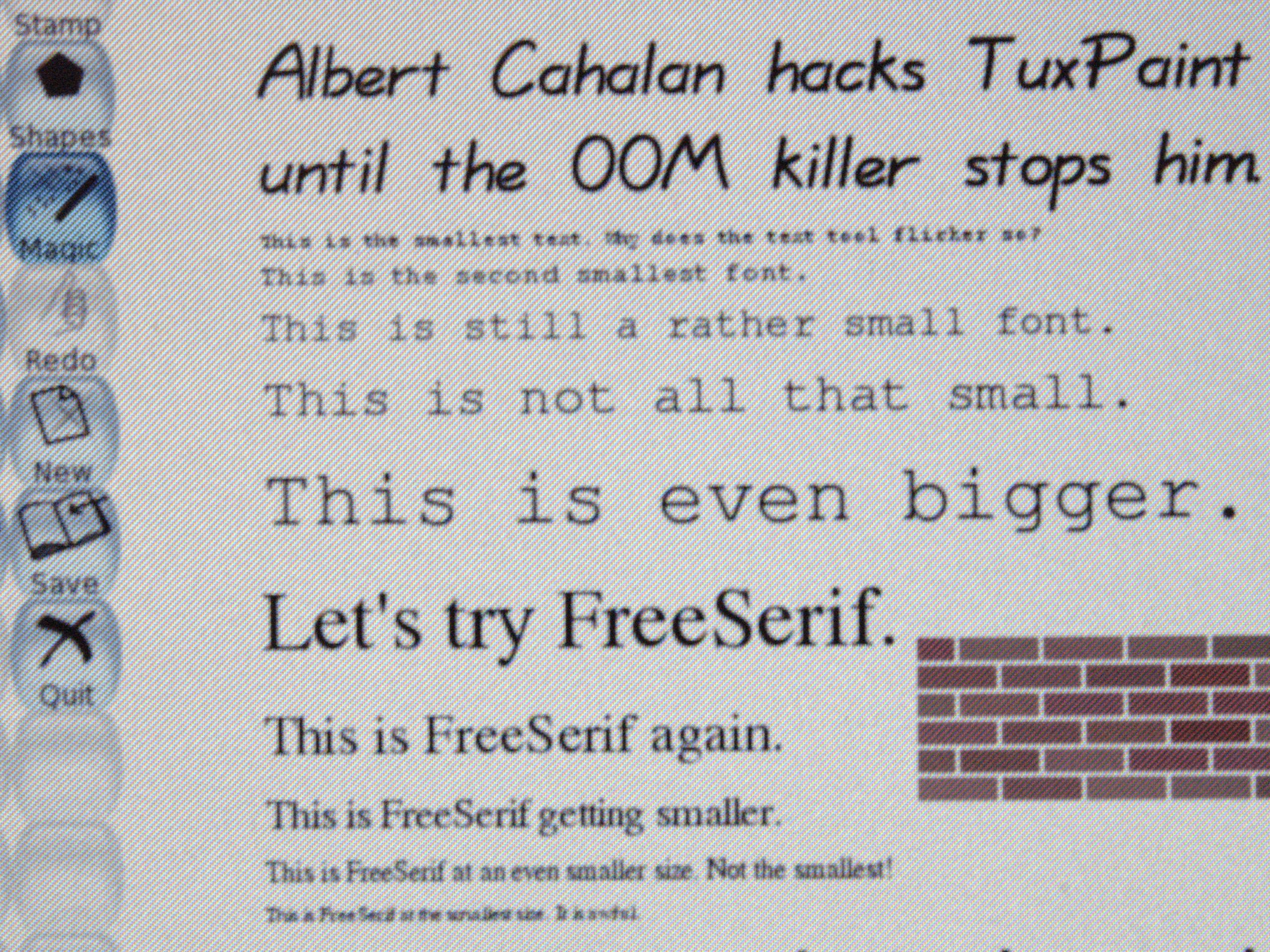 | current | 01:35, 12 March 2007 | Error creating thumbnail: Unable to save thumbnail to destination | 2,560 × 1,920 (1.12 MB) | Imported>AlbertCahalan | Tux Paint on a B2 OLPC XO |