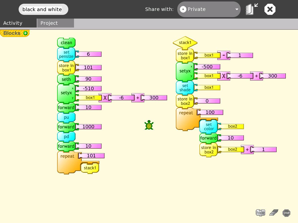 | current | 00:17, 20 January 2008 | 1,200 × 900 (114 KB) | Imported>Joviko | http://www.flickr.com/photo_zoom.gne?id=2202877304&size=o Created by "catmoran"; licensed under {{CC-BY-SA}}. A screenshot of an OLPC XO running Turtle Art, and displaying the "source code" created by "catmoran" for showing the full spectrum of Turtle A |