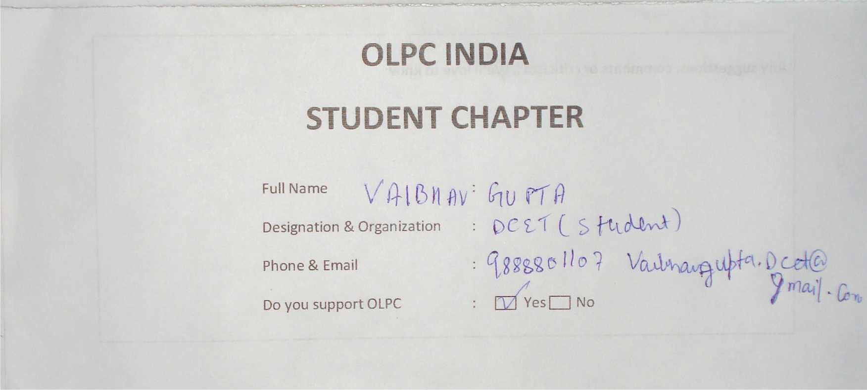 Membership form of OLPC India Student Chapter