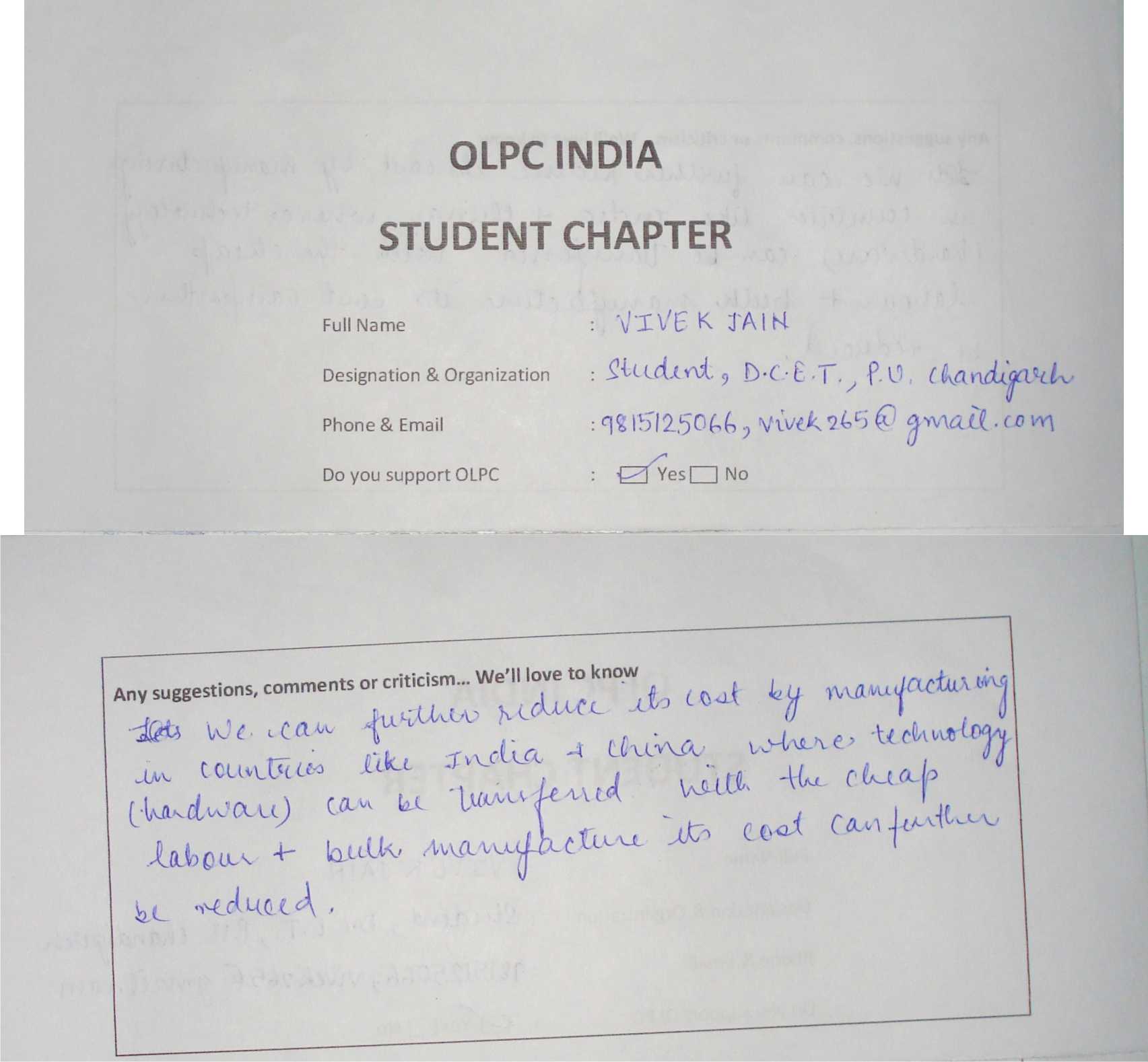 Membership form of OLPC India Student Chapter