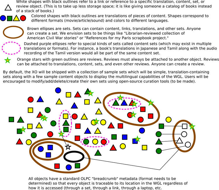 Graphical explanation of proposed schema for curation/review/set-making for world global library, discussed @ OLPC hq's April 14, 2007 by sj, justin, mel, and todd