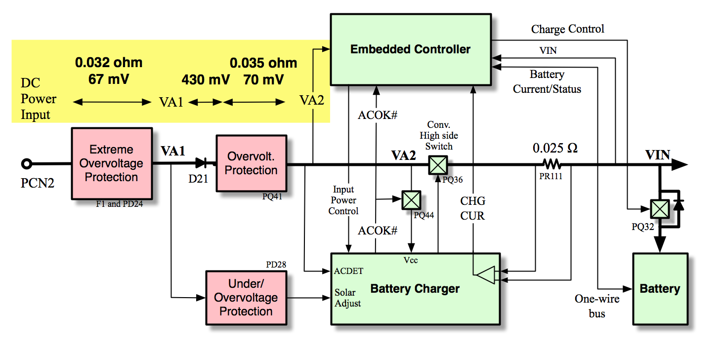 The DC Input Circuit of the original XO-1.5 laptop, showing the voltage drops in the input protection circuitry.