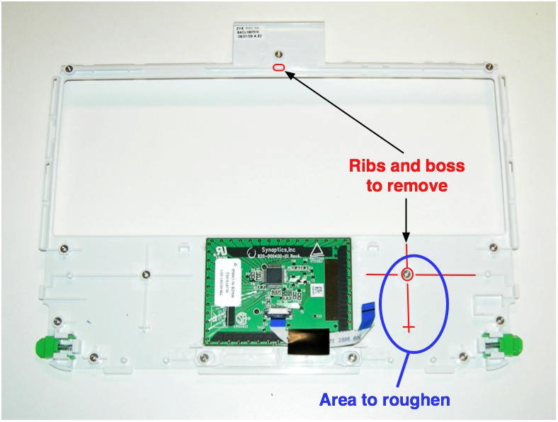 Keyboard bezel, showing where ribs and a boss need to be removed.