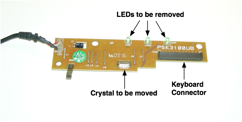 USB Keyboard Controller PCB, showing LEDs which should be removed and the crystal which has to be moved.
