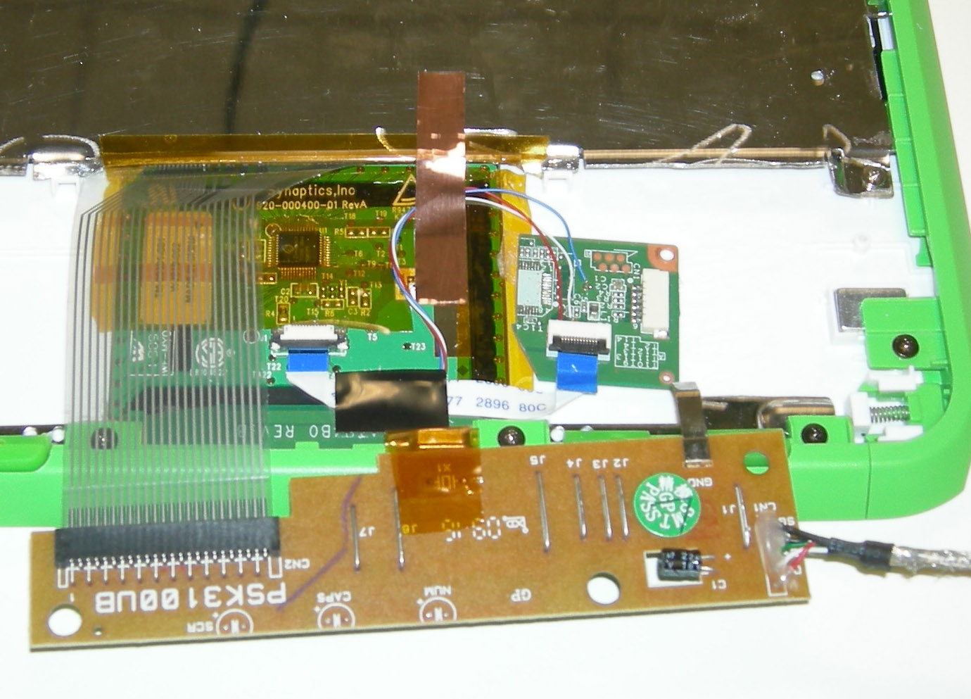 Note the ground strap connecting the touchpad to the keyboard tray.