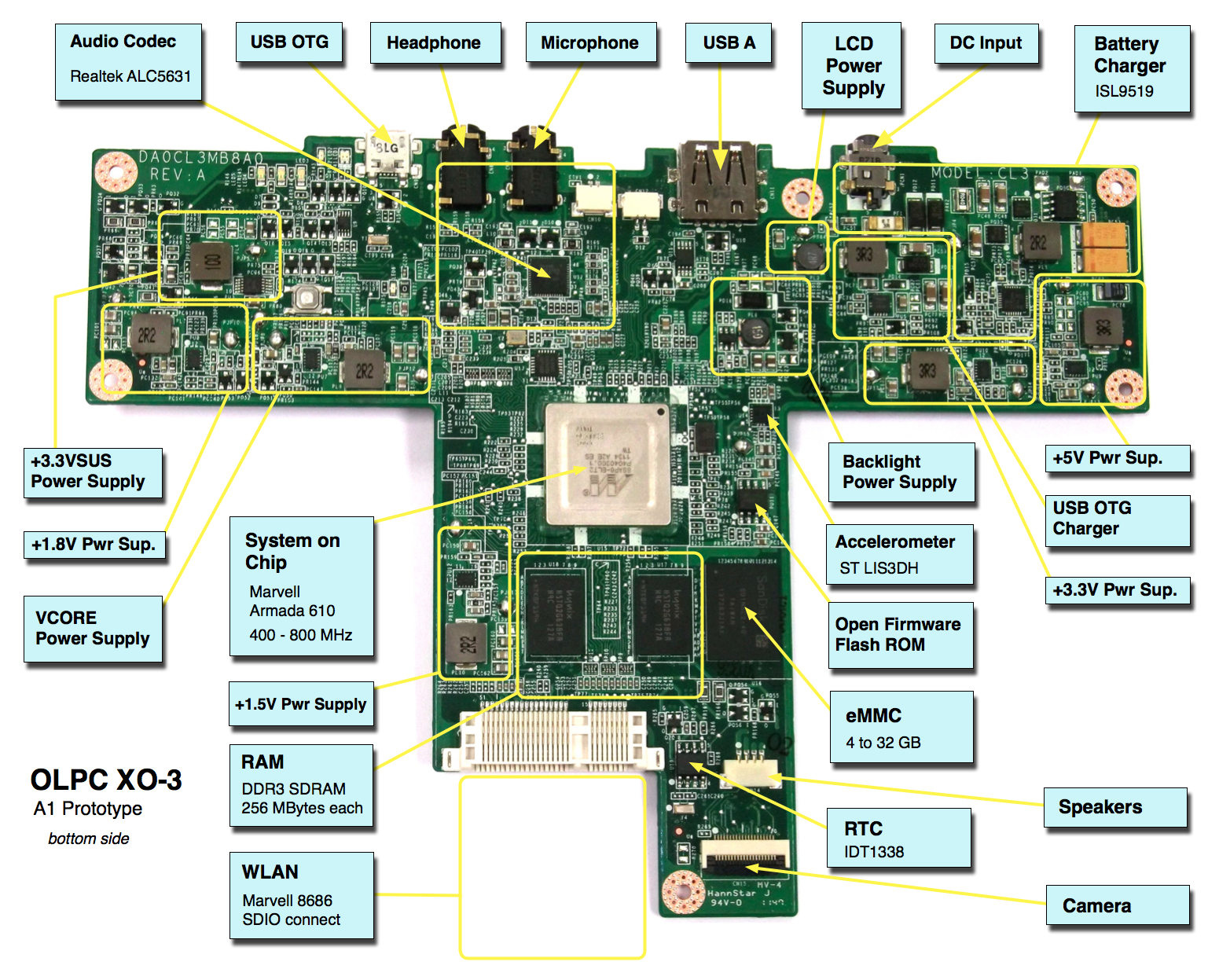 Annotated photo of bottom side of XO-3 A1 version motherboard