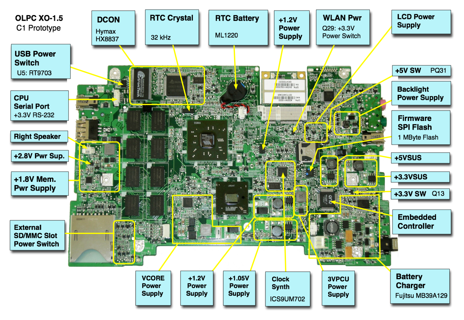 Annotated photo (for repair) of bottom side of XO-1.5 C1 version motherboard. (PDF version)
