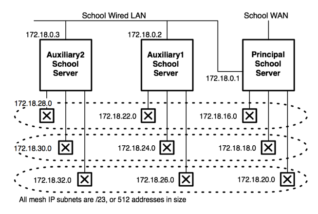 A drawing of one way of connecting school servers to provide coverage of larger schools.