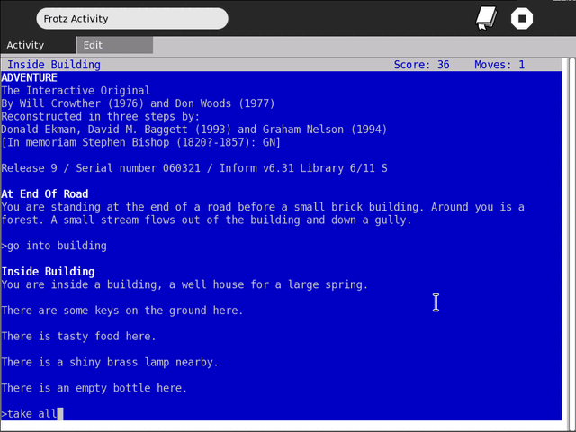 | Short description: | [[Short description::This activity is a wrapper around the Unix port of Frotz, which is an interpreter for Infocom games and other Z-machine games. It includes one game, the classic Adventure. You can download more games here: Frotz/Games.]] |