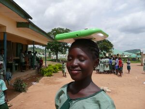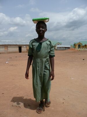 • Nigerian girl carrying a laptop on her head (at right)