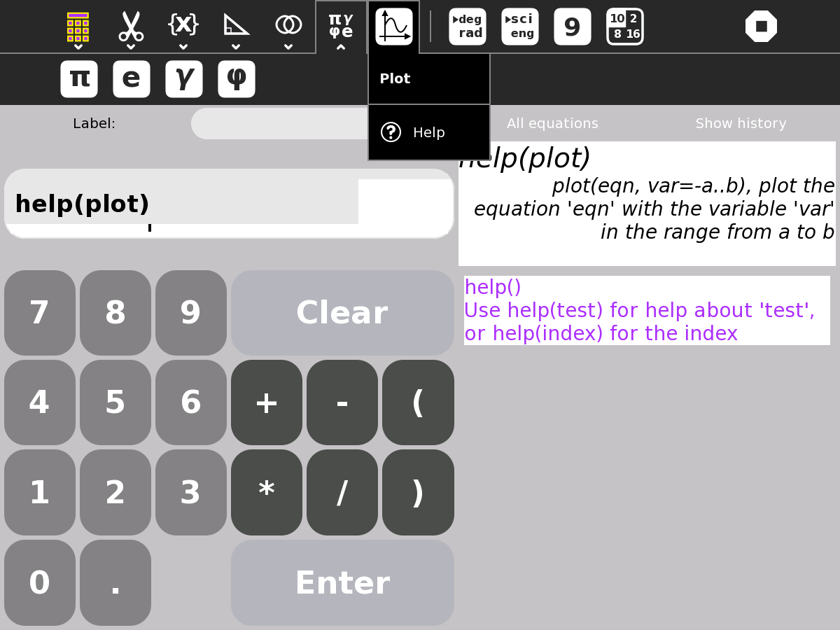 including topics not supported on the menus. Help is not provided for the constants pi, e, gamma (Euler-Mascheroni Constant, and phi (Golden Ratio), but these can be looked up on the Internet. Clicking their icons inserts their numeric values.
