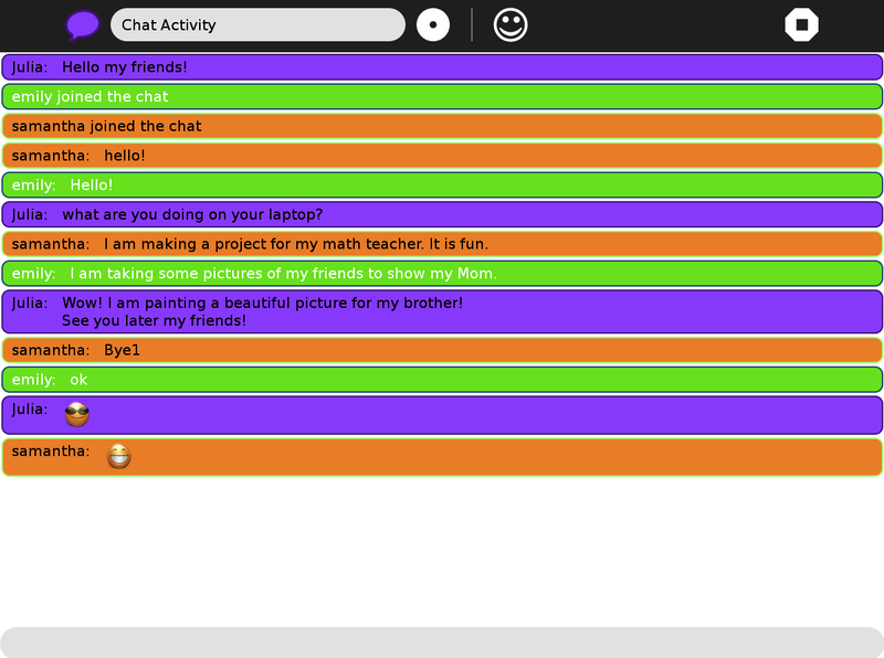 One of the most important features of Sugar is the ability for you to collaborate (chat!) and share a project that you are working on with others. This can take the form of multiple cursors in a document, multiple musical instruments, two players in a game, multiple uses in chat (as above), and so on.
