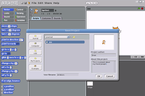 In Scratch, for example, you must go to "File" then "Save As" then give your project a name next to "New Filename" then click "OK".