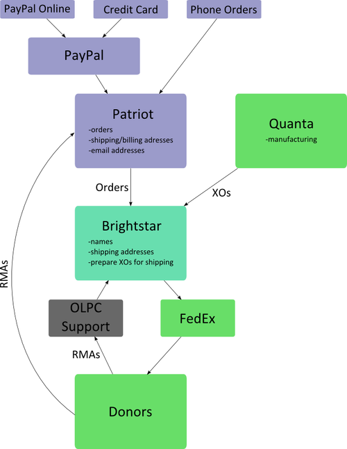If the laptop is returned as unable to deliver or RMA (replacement request) it goes to Brightstar. Brightstar doesn't have email addresses or the ability to send out messages to donor base. Notifications about shipping have to go back to Patriot to get sent out to donors.