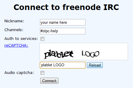 Navigate to http://webchat.freenode.net. Fill in the screen with the information shown below. (Put your own nickname instead of your-name-here; and if you have a different channel to go to, like #olpc-meeting for example, type that name instead of #olpc-help.) Click the 'Connect' button.