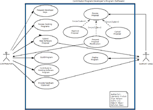 Description: This use case is designed for the Contributor Program’s software application process. This scenario covers how a Contributor submits a software application proposal, such as a request for a paint program upgrade, and how the Support Gang (OLPC) deals with it.