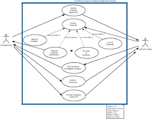 Description: This use case is for the Contributor Program’s proposal process for developing peripheral hardware. The use case shows the process of a contributor project submission for hardware proposals and how the Support Gang (OLPC) deals with it.