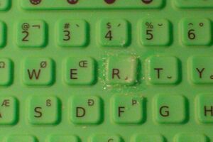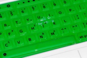 After removing the keyboard, gently lift off the green silicone keypad, being careful to not tear additional keys. Lay it on your table protector.