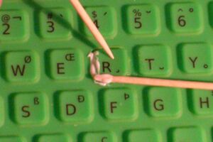Using one toothpick to hold the key in place, gently apply a small amount of silicone to the torn sides of the key with a second toothpick.
