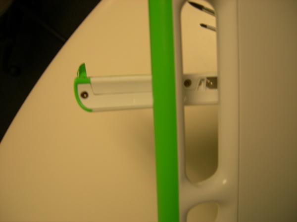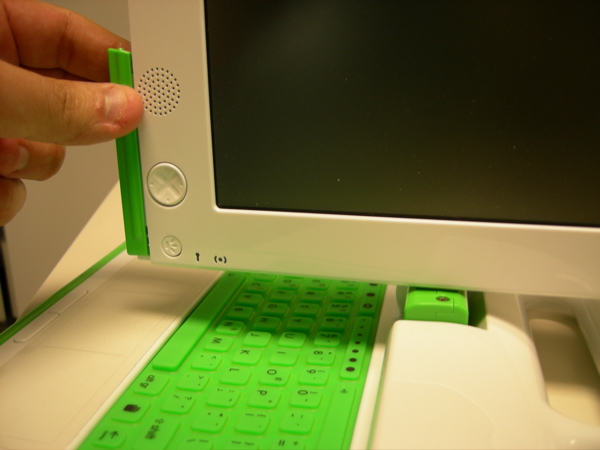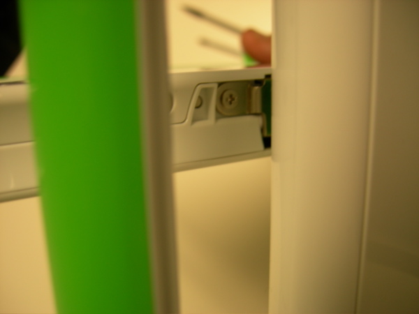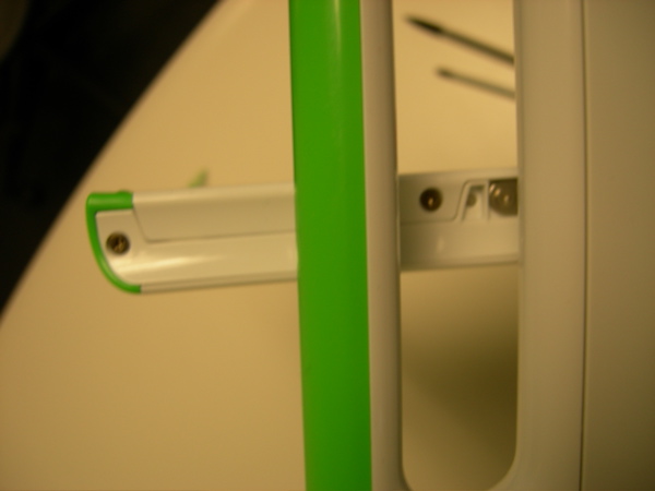 Once these screws are removed, the short green bevels on the side of the monitor can be removed, as shown above, and in the next three images.