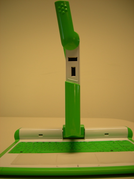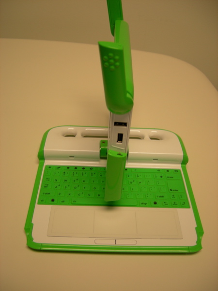 With the screen rotated, flip the laptop over. Behind the handle, you will see two screws, one on either side of the hinge. Two more screws are located on the bottom of the monitor on either end. Unscrew all of these screws.