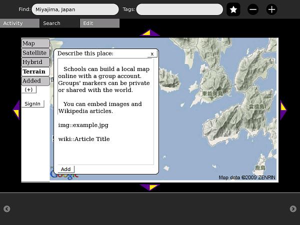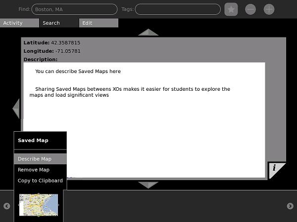 Los niños pueden usar La actividad del Mapa para explorar, escriber, y poner las fotografías y los vídeos en un mapa. Colaboración es posible con otros en la clase o sobre el Internet. Pueden savar el trabajo del mapa en sus Journal.