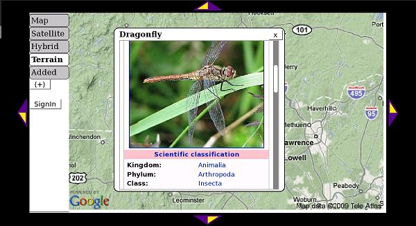 Clic en Navegador Web sobre Edit a entrar la biblioteca de los mapas. Nuevo (new) y cerca (nearby) mapas están aquí, y locaciónes de Wikipedia Español (Wiki (ES)) y fotografías de Panoramio.
