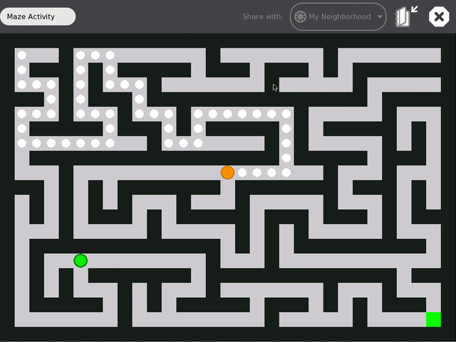 Short description: Short description::A simple maze game for the XO laptop. You can play by yourself or race to solve it with your buddies. Up to 3 people can play on a single XO laptop and lots more can play when shared over the network.
