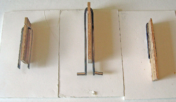 Now comes the part that gave me a half-day's trouble until I figured it out. The idea is to hold the tuning fork in the center of the bend and mount the fork+holder on something that can hold the pickup and drive coils. I used foam-core "board" but I'd recommend something stiffer -- a wood sounding-box would be really nifty. What I figured out was: cut a strip of hard wood (e.g. oak) about 0.125 - 0.150 inch wide x 1.0 inch tall by 3-4 inches long. In one end, about 1/2 inch up and about 1/2 deep, cut a slot the width of the place where you hammered down the U-end of the fork. Shove this U-end into the slot "backwards" so the board is now running between the tines. This both acts as a stiffener and a sound-coupler into a sounding-box, if available. I used superglue to glue the fork into slot, then glued the wood+fork on the foam-core "board".