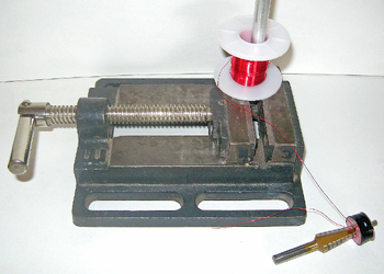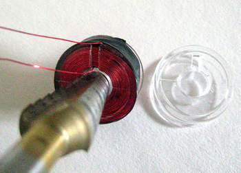 - Insulated copper “magnet” wire -- recommended is #30 AWG (American Wire Gauge). The mean length of turn on the bobbin is about 1.0 inch per turn, so 500 turns comes out to about 45 feet (15 meters). 500 turns will fit on the bobbin. Alternates: #28 AWG (coarser wire -- 300 Turns will fit on the bobbin), #34 AWG (much finer wire -- 1000 turns will fit on the bobbin). The fine wire becomes hard to wind and subject to breakage.