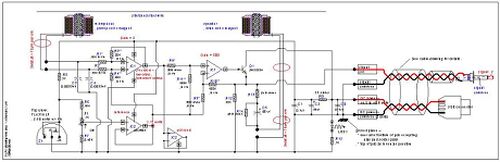 This is a fussier experiment. A one-way telephone requires two of the microphones described above plus a high-gain audio amplifier in between. One successful design I've tried for the amplifier follows the same design-concept as the "oscilloscope probe" described in Measure/Projects, but with two differential amplifiers. A balance must be struck in the design between a need for total high gain (e.g. between 1000 and 2500), errors caused by input-offset and gain-bandwidth, cost, complexity etc. The circuit shown does four things: (1) amplify the input, (2) move the "zero" of the signal "up" to 1.17 volts, thus placing the signal-trace in the center of the laptop's screen, (3) prove capable of driving into the laptop's 2000 ohm (2K) input impedance, (4) prove capable of driving the speaker coil with enough current.