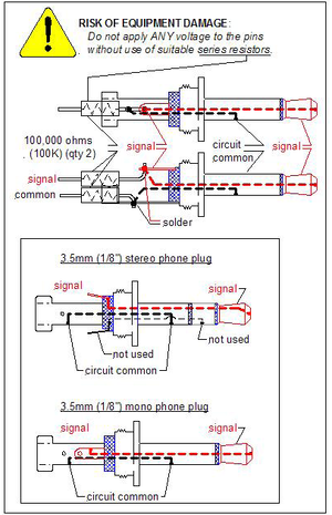 Note 0: A solderable connector is the Radio Shack 274-286 "Mono 1/8" Phone Plug" with solder terminals and screw-on housing. A possible stereo connector is the similar Radio Shack 274-284 1/" Stereo Phone Plug" with solder terminals and screw-on housing. Only 1 of the two input-terminals of the stereo connector is available for input. The cost of the Radio Shack Mono plug is $2.99 US for quantity two plugs; cost of the Stereo plug is $3.99 US for quantity two plugs (neither are gold-plated). Other sources for resistors, wire, solder, naked USB and audio jack-connectors, "ball clips" (probes) etc can be found at www.mouser.com and www.digikey.com. Quantity pricing (e.g. Kobiconn plugs, 3.5mm MONO Mouser Part Number 171-PA-3191-1-E) is much reduced compared to the Radio Shack pricing (e.g. $0.71 USD single unit, $0.45 USD at quantity 100).