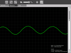 Input:One can connect sensors/give input voltage through the pink Mic jack on the left side of the display screen. When nothing is connected there, the default signal is the sound signal from the built in Mic on the XO. Graph: The green moving line on the screen indicates the signal
