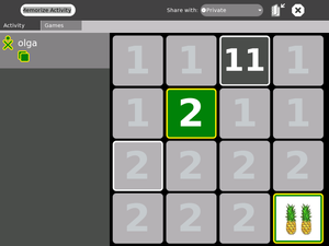 Click on "Load demo games" and select 'addition' from the pull-down menu. You will get a grid of 16 squares. Each square in the top two rows will be marked with the number 1; the squares in the bottom two rows will each have the number 2.
