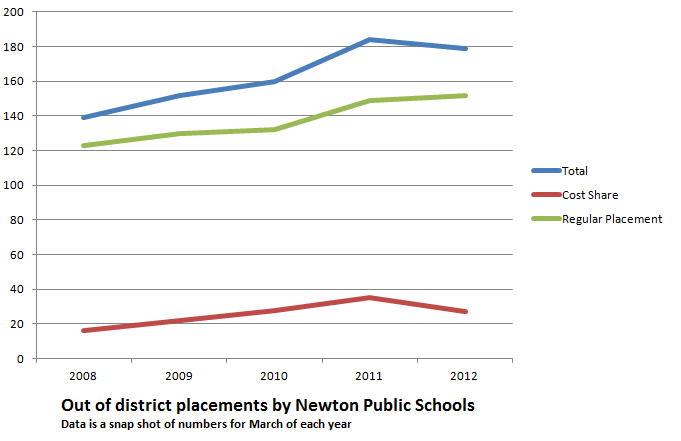 The fraction of "cost share" (placed under legal settlement with NPS) placements declined in 2012. The overall out of district placements also started to decline.