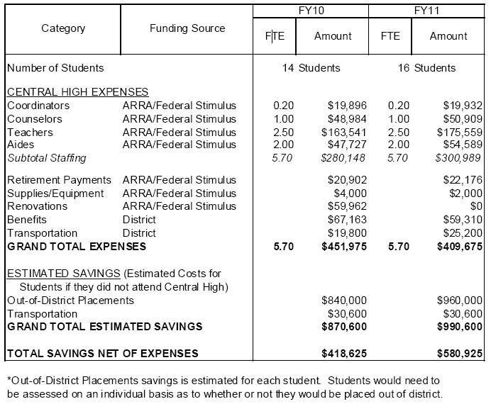 Below is a summary of Central High School costs and estimated savings for FY10 and FY11.