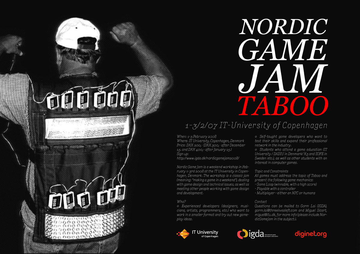 Nordic Game Jam is a three-day, open-source event at the IT University in Copenhagen, Denmark; this years topic is Taboo. Starting on Friday, 1. February 08, around 150 participants will form teams, start rapid prototyping of games, and deliver their results by Sunday, 3. February.