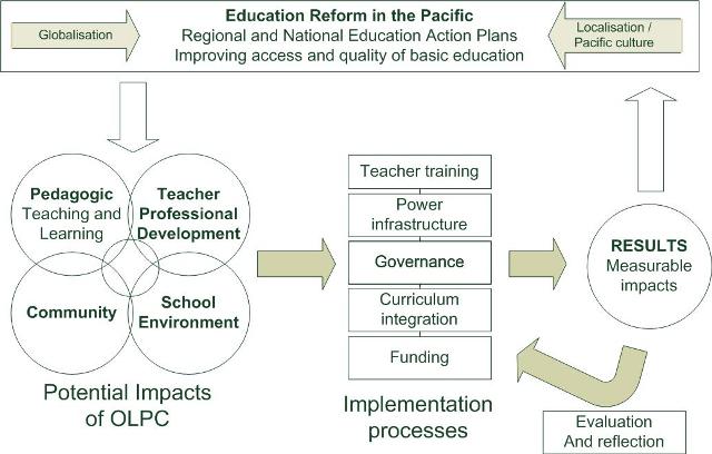 To understand the potential impacts of an OLPC programme, one can start with more generally understood impacts of ICT in education* [1], and then focus on the particular characteristics of OLPC, with its core principles, specialised technology and foundations in constructivist learning [2]. We can then study the processes by which an OLPC project can affect change in terms of a traditional school effectiveness model, and the challenges that are presented to countries wishing to implement OLPC programmes [3]. Finally, we must understand the priorities for education reform in the region, in the context of globalisation and the need to steer the reform towards more culturally relevant approaches in education [4].