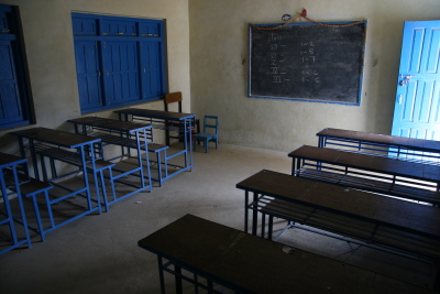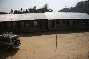 The school is nestled into a hillside, making it a poor location for a wireless antenna. We are placing the wireless equipment that will connect the school to the Internet on the hillside from which this photo was taken.