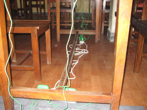 Ram and Rabi decided that we will install a “charging rack” at the back of the classroom. The children will unplug the XO’s and use them at their desks untethered by power cables. There will be a space and charger for each child’s XO in the rack. We do not plan to run power cables to the desks. The chance that kids will trip over power cables is just too high. Further, the power strips available in Nepal are of very low quality, there is high chance that children will shock themselves while removing their plug from the power strips. It is not uncommon to see a spark when you insert a plug into the particular power strip available in Nepal.