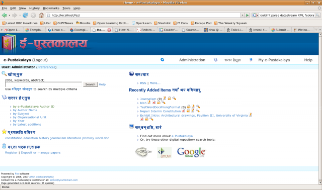 The e-library is an online library system that run on Ubuntu 7.10 desktop (I am planning to change this to Ubuntu 8.04 server–mainly because I don’t want the desktop applications to take up valuable memory away from the server applications). The e-library uses fedora commons as its library engine, and has Fez as its GUI. Fedora commons also uses Tomcat a Java application that talks to apache, but can also act a server on its own. More on “e-pustakalaya” or e-library later.