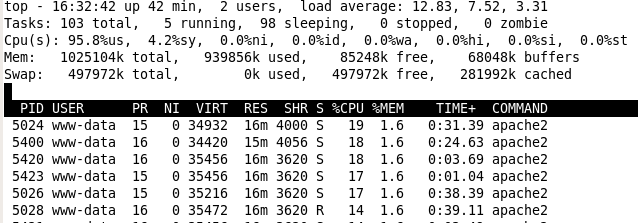 - 2. Resource Utilization: One thing i have noticed is that my server had a huge overhead on CPU and my memory was down to 12Mb free, which caused the server to crash. This happened when i simulated a 100 user connection making one new connection every 10 sec….fetching a 1.4 Mb pdf file. So hardware really matters, and it is really a good idea to optimize apache and any application service for your hardware specs. Reading memory usage and CPU load is a tricky thing. I found out that the memory information that say $top gives for a process is not actually correct view of what that process is doing. Similarly, making sense of load average and CPU% requires a little more knowledge of the Linux system.