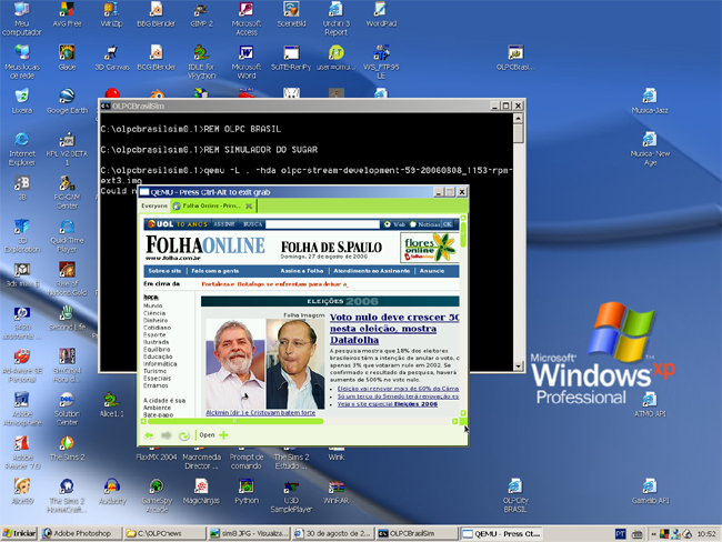 Foi disponibilizada uma versão do simulador do micro OLPC para ser instalada e trabalhar como uma aplicação dentro duma tela em Windows (veja a figura). Não substitui o Windows! Você não precisa ter medo...