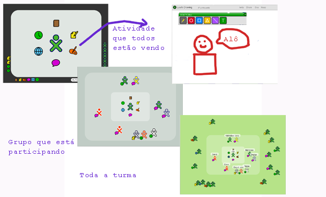 Como você pode ver na figura, num terceiro nível de zoom aparecem todos os alunos da turma que estão acessíveis no Mesh. Através de "drag & drop" do próprio avatar se pode entrar ou sair de um grupo que esteja fazendo uma atividade "partilhável". Pode-se ver quem está "em volta" de cada atividade, quem está só etc.